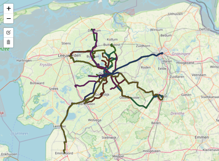 Deze tool laadt haltes en lijnen in van verschillende typen ov: bus, trein, metro, tram en veerpond. In onderstaande afbeelding zijn alle buslijnen te zien die door Drachten gaan. Bushaltes en lijnen bevatten allerlei meta-data over bijvoorbeeld operators (bijv. Connexxion), line nummer, toegankelijkheid en voorzieningen bij haltes en nog veel meer.